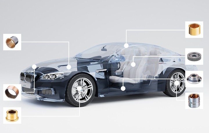 如: 涨紧轮专用轴套、减振器专用轴套、减振器导向器总成及活塞、变速箱轴套及垫片、座椅调节系统轴套、门铰链及行李箱铰链轴套、雨刮器轴套、空调压缩机轴套、启动电机轴套、助力转向泵轴套、转向系统轴瓦、制动系统及踏板总成轴套等。